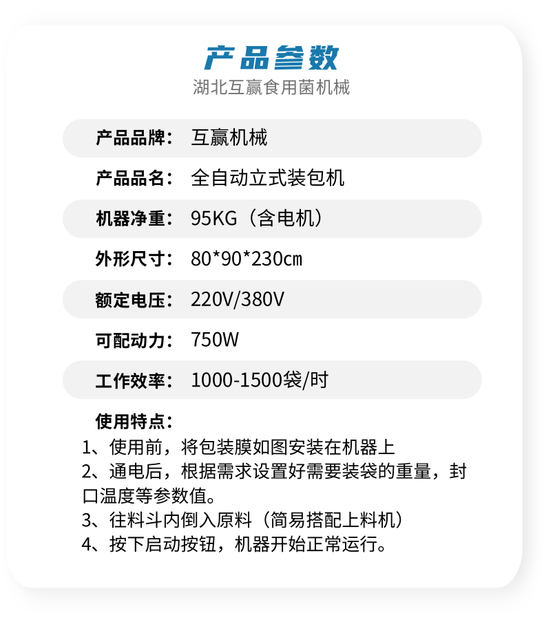 近年來代料香菇裝袋機的發(fā)展,越來越迅猛。其規(guī)模不斷擴大,品種不斷增多,地域限制越來越少。是農(nóng)民增收的可靠保障,也是地方政府的經(jīng)濟支柱。自動套袋食用菌裝袋機廣泛用在香菇、木耳、平菇、金針菇、茯苓、灰樹花、姬菇、秀珍菇等食用菌種植領(lǐng)域。是工廠、基地、合作社、家庭農(nóng)場理想的工廠化生產(chǎn)機械。生產(chǎn)規(guī)模的大小可根據(jù)資金、銷售量、經(jīng)營方式、技術(shù)力量、資源條件等綜合因素來確定,可用單機,也可組合設(shè)計成半機械化...